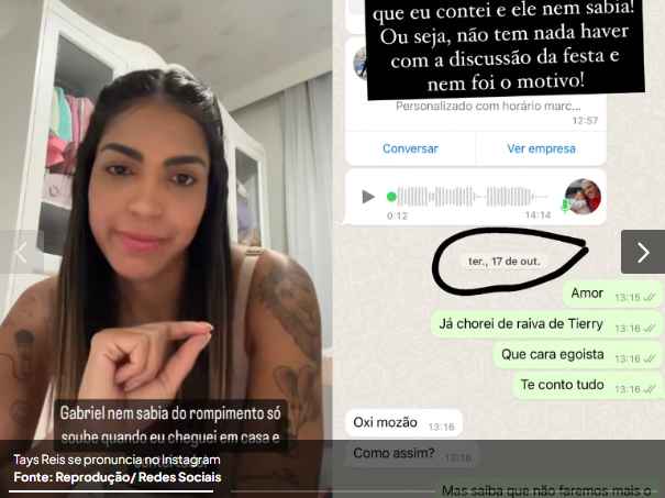 “Tierry rompeu comigo dia 17 [de outubro], eu tenho print, mas nem quero entrar nesse nível. A festa do Rodrigo Faro foi dia 19. Já tínhamos resolvido, cada um pro seu lado”, começou a artista.